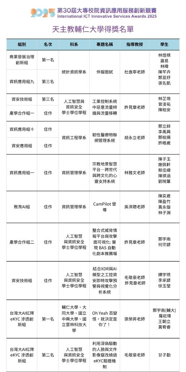 輔仁大學在此次賽事表現亮眼,由統計資訊學系、資訊管理學系、人工智慧與資訊安全學士學位學程及資訊工程學系9支團隊,勇奪12項大獎,展現輔大在資訊應用、AI與資安領域的深厚實力。