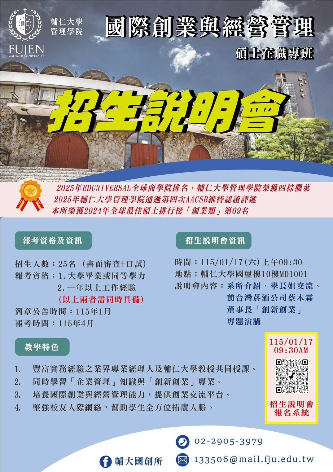 輔仁大學管理學院「國際創業與經營管理碩士在職專班」招生中,歡迎報名招生說明會,以了解科系學習與準備方向~