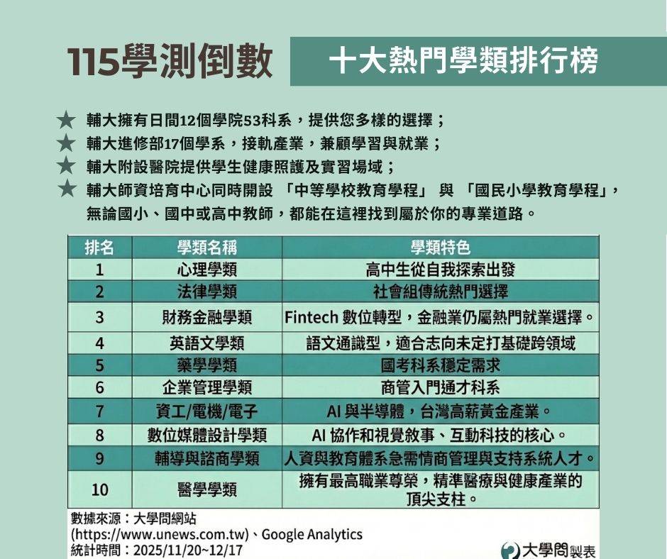 115 學測進入最後衝刺關鍵期,大學問網站彙整 2025 年 11 月 20 日至 12 月 17 日間、超過 33 萬筆科系瀏覽數,涵蓋 9.3 萬名真實使用者的 GA4 大數據,並交叉比對教育部 113 學年及近 20 年官方統計資料,公布高中生最關注的「十大熱門學類排行榜」。